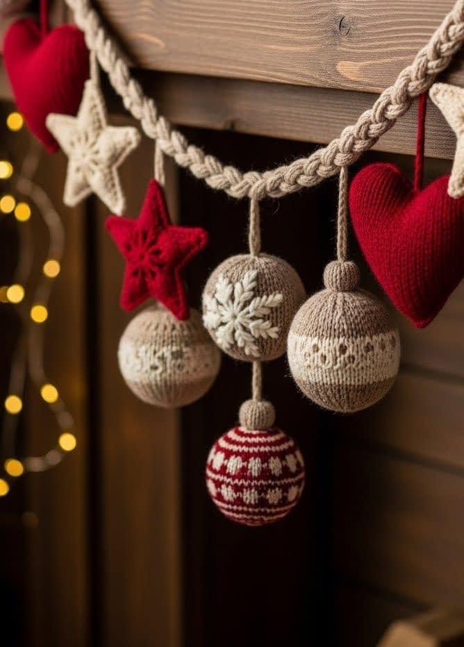 This decorative knitted garland mirrors the prompt’s beautiful display of hand-knit stars, snowflakes, hearts, and baubles in deep red, cream, and beige tones. It is soft, dimensional, and visually stunning, making it a perfect winter decoration or handmade holiday gift.