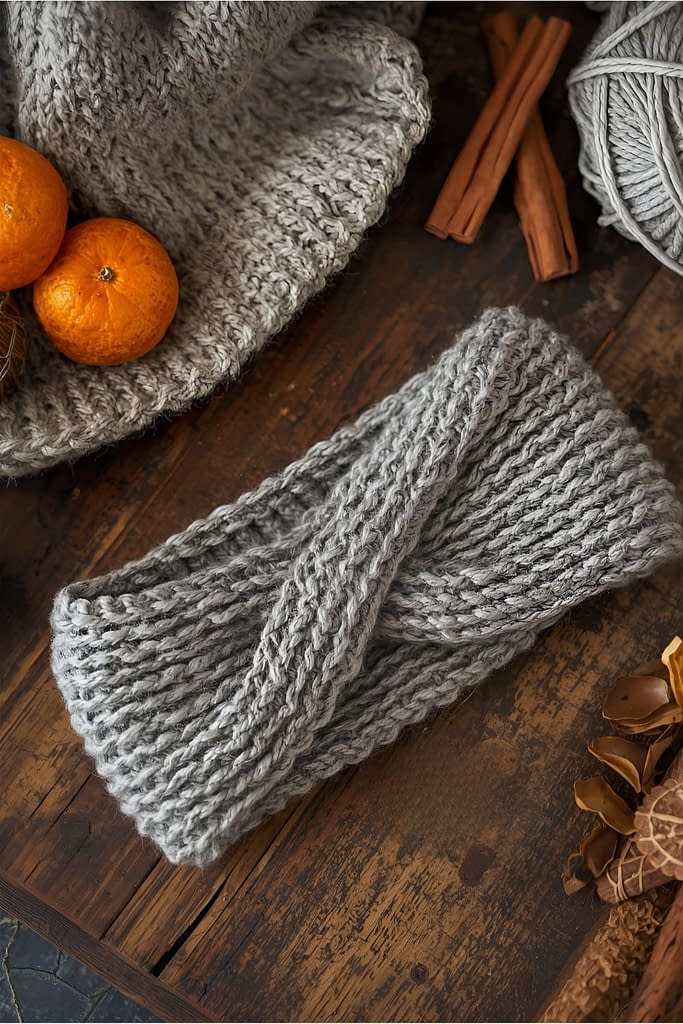 The headband is knitted as a long rectangle, and the twist is created during assembly by folding in a specific way before seaming. The headband uses a textured stitch pattern that adds depth and visual interest similar to the realistic, soft wool texture in the prompt.