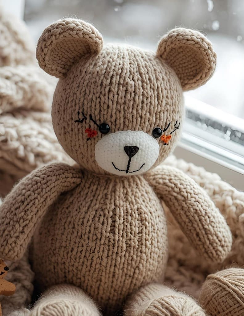 Knitted plush toys make heartwarming gifts, especially during winter. The prompt describes a soft knitted bear or bunny made from tan yarn, sitting on a wool blanket near a snowy window. This pattern is created to reflect that same charm. It is very beginner friendly and focuses primarily on simple shaping, basic stitching, and assembly.