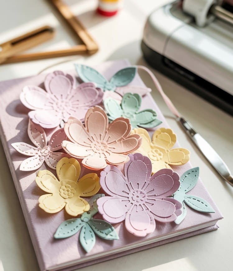 This project uses layered cardstock to create a dimensional floral design. It is perfect for journals, personal diaries, and aesthetic stationery.