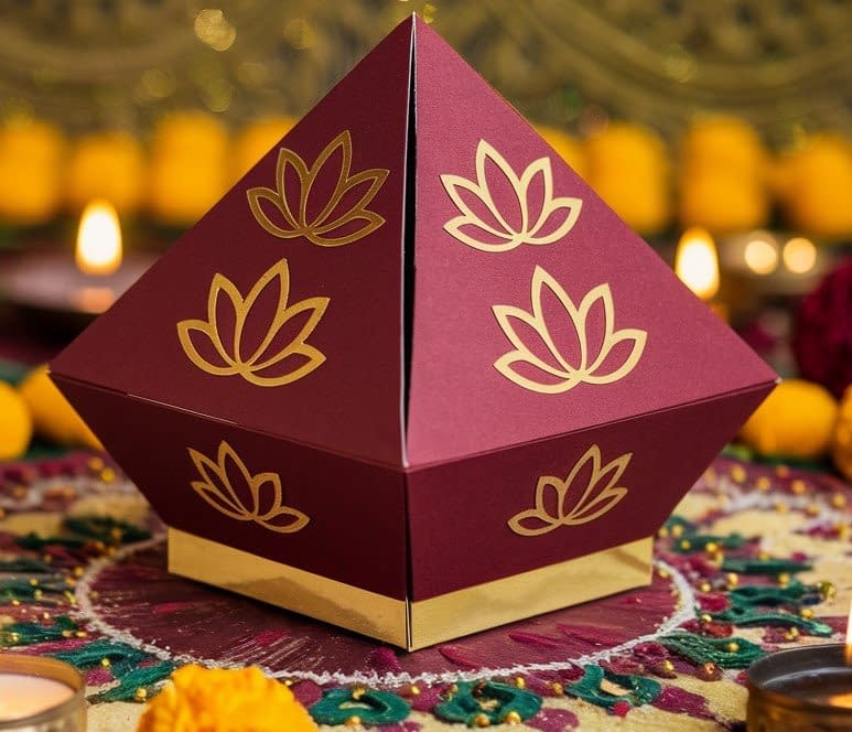 Attach Cricut-cut lotus flower motifs or small gold embellishments to the sides of the box. Top with a gold flame-shaped cutout to resemble a diya lamp. - Display or Gift