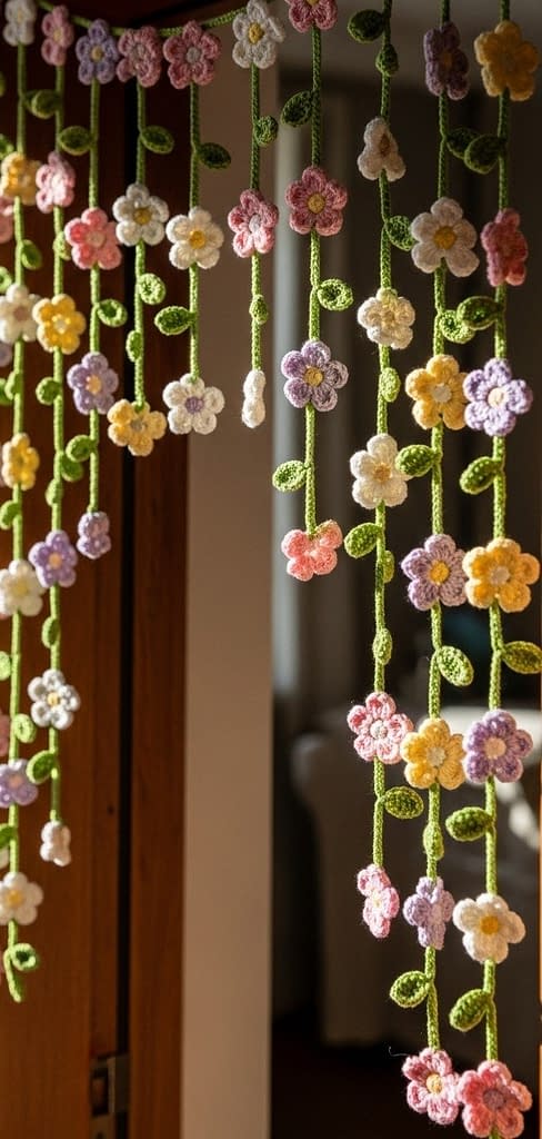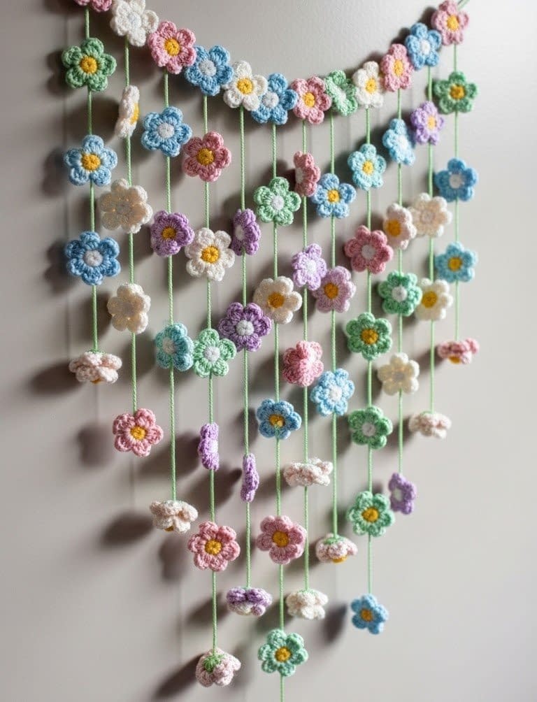 The String With your green yarn, chain ten stitches. Attaching a Flower: Insert your hook through the top of a petal on one of your finished flowers (choose a petal that points upwards). Slip stitch through the petal to secure it to your working chain. Spacing: Chain twelve to fifteen stitches. Pick up a different colored flower. Insert hook through the top petal. Slip stitch to join. Continuing: Repeat the “Chain 15, Attach Flower” sequence until the strand is the desired height. Make 5 to 10 of these strands to create the full curtain effect seen in the image. Hang them about three inches apart on your wall or window frame.