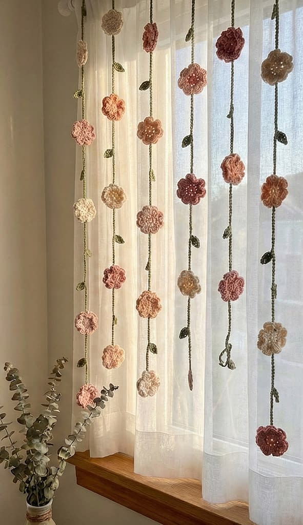 This first pattern is inspired by the delicate, airy aesthetic of vertical wall hangings. Based on the visual of the cream and dusty pink flowers suspended on long green vines, this project is perfect for creating a “living wall” effect without the maintenance of real plants. The flowers are flat and simple, allowing them to lay clearly against a wall or window pane. The construction involves creating individual flower motifs and then attaching them to long, vertical chains interspersed with small leaves.