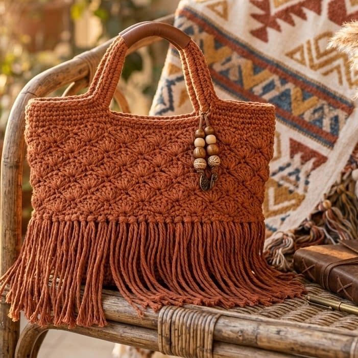 The bobble textured tote introduces dimensional stitches that add playful detail. The daisy granny square tote celebrates classic crochet motifs and colorful design. The boho fringe tote creates a relaxed and artistic style through textured stitches and decorative fringe.