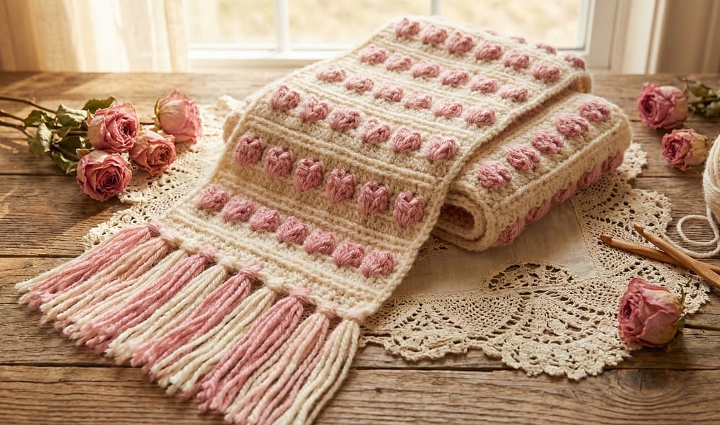 The Cottagecore Tulip Stitch Scarf captures warmth, nostalgia, and handcrafted charm. Using warm cream and soft floral pink yarn, this design feels romantic and timeless. Long tassels at each end add movement and a relaxed, vintage-inspired finish.