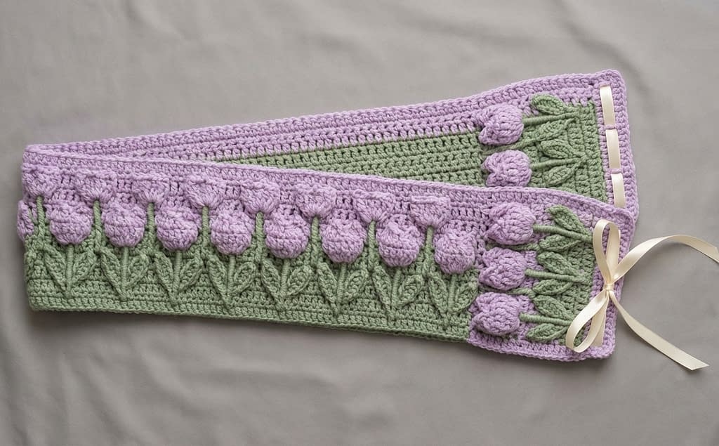 This scarf alternates tulip stitch rows and single crochet rows, with color changes used to highlight the floral texture. The ribbon is added after the crochet work is complete and does not affect the structure of the scarf.