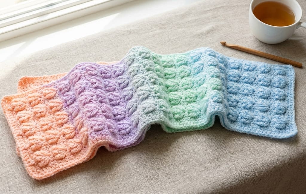 After completing four to six rows in one color, switch to the next pastel shade at the end of a row. Continue the same stitch pattern, allowing the colors to flow naturally.