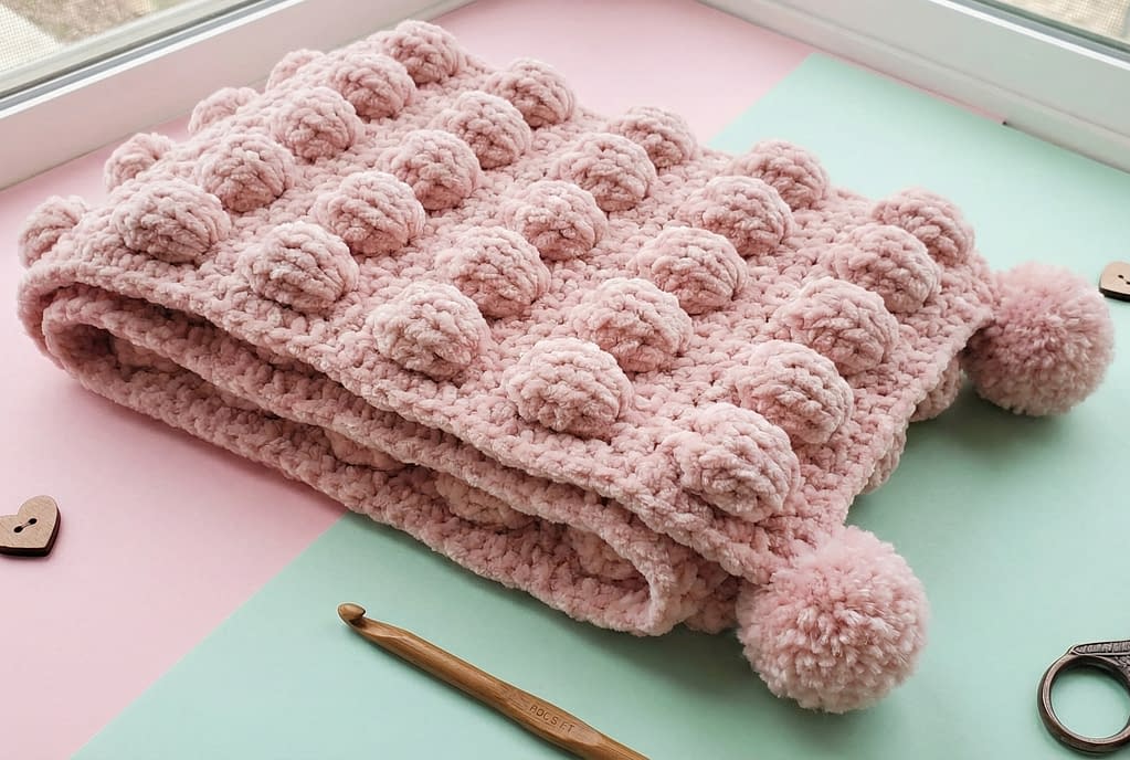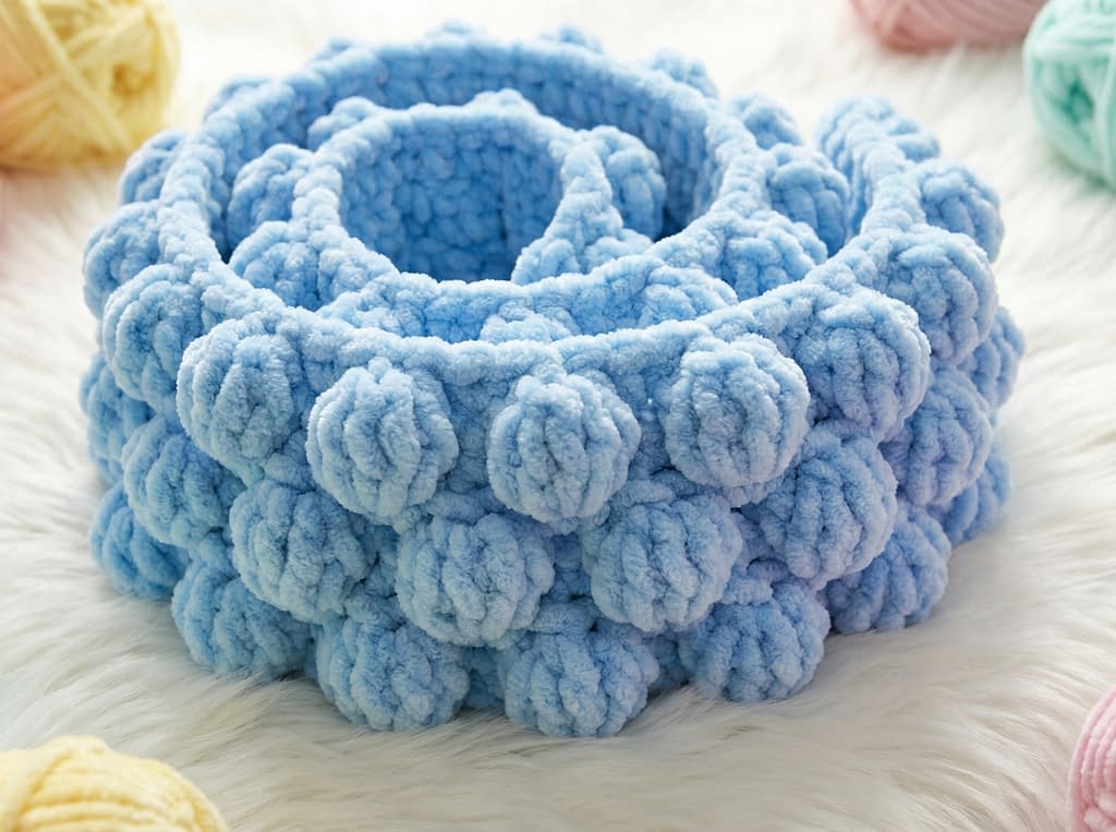 This pattern uses a modified tulip stitch with slightly larger stitch groups to enhance the puffed appearance. The plush yarn naturally exaggerates the stitch texture.