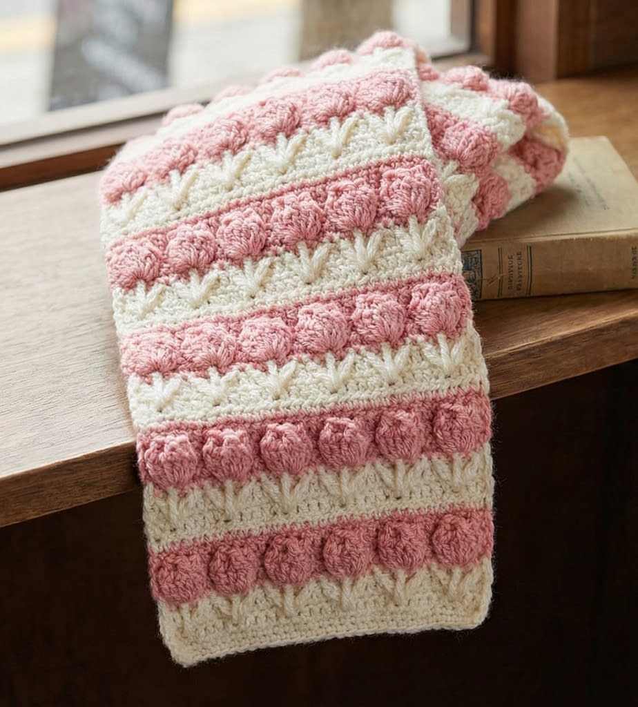The Pastel Tulip Garden Scarf is inspired by the gentle colors of spring flowers and soft garden mornings. This design uses pastel pink, butter yellow, and baby green yarn to create rows of plump tulip stitch petals that feel calm, warm, and visually soothing. The raised tulip texture gives the scarf depth, while the color placement keeps it light and airy rather than heavy.