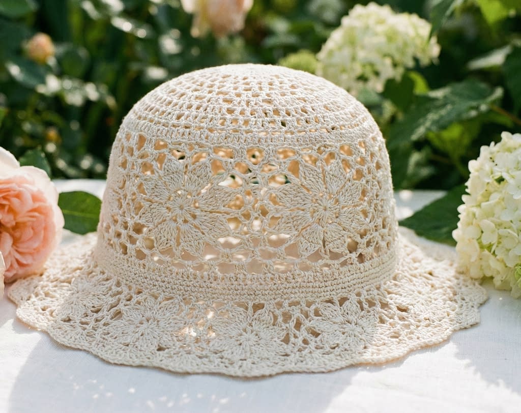 This lacy crochet sun hat is elegant, airy, and visually delicate. The openwork floral pattern allows light to pass through, making it perfect for warm summer days when breathability is essential. Despite its delicate appearance, the hat maintains structure through careful stitch placement and balanced pattern repeats.