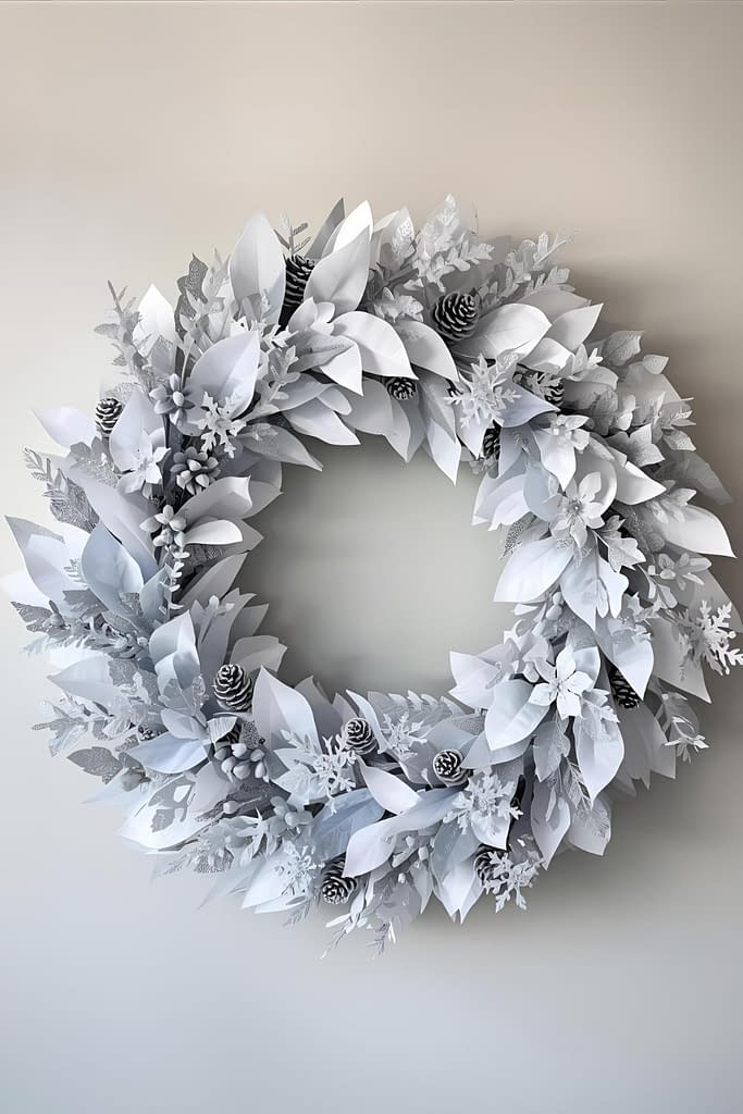 This wreath captures the calm and beauty of winter with white, silver, and icy blue tones, perfect for holiday or winter-themed decor.