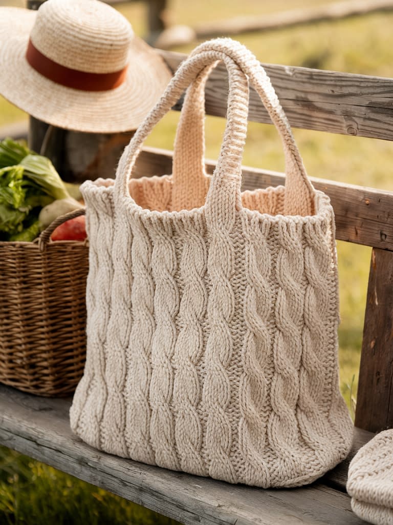 This tote combines beauty and strength with classic cable patterns. It’s ideal for knitters who enjoy texture-rich projects. The cables create a thick, durable fabric that holds its shape, making it excellent for carrying heavier loads like books or produce.
