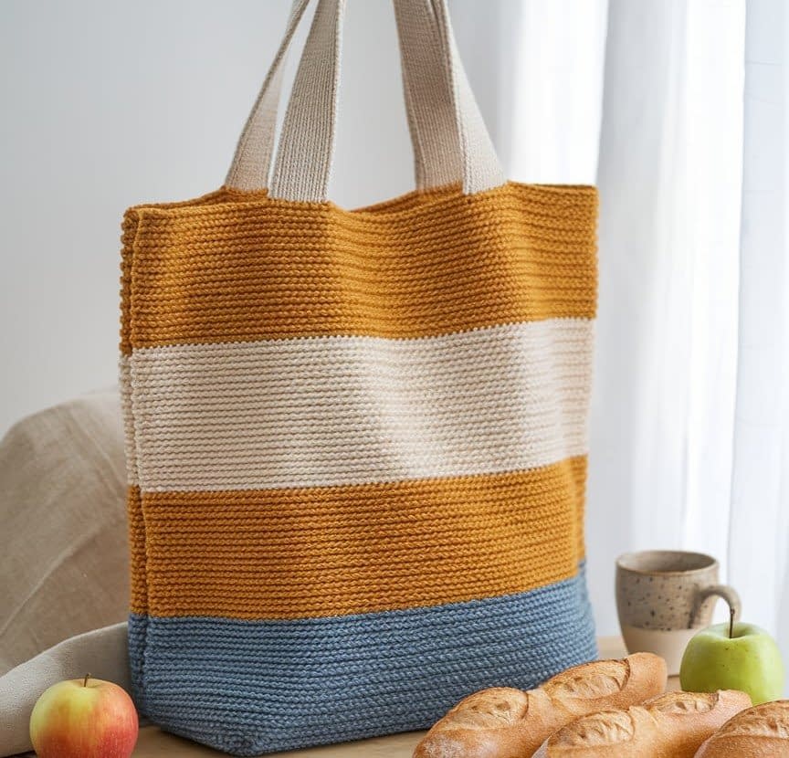 This colorblock tote bag combines simplicity with a bold, modern look. The horizontal color bands make it visually appealing and easy to customize. The pattern uses basic knit and purl stitches, making it ideal for confident beginners who want to experiment with color transitions.