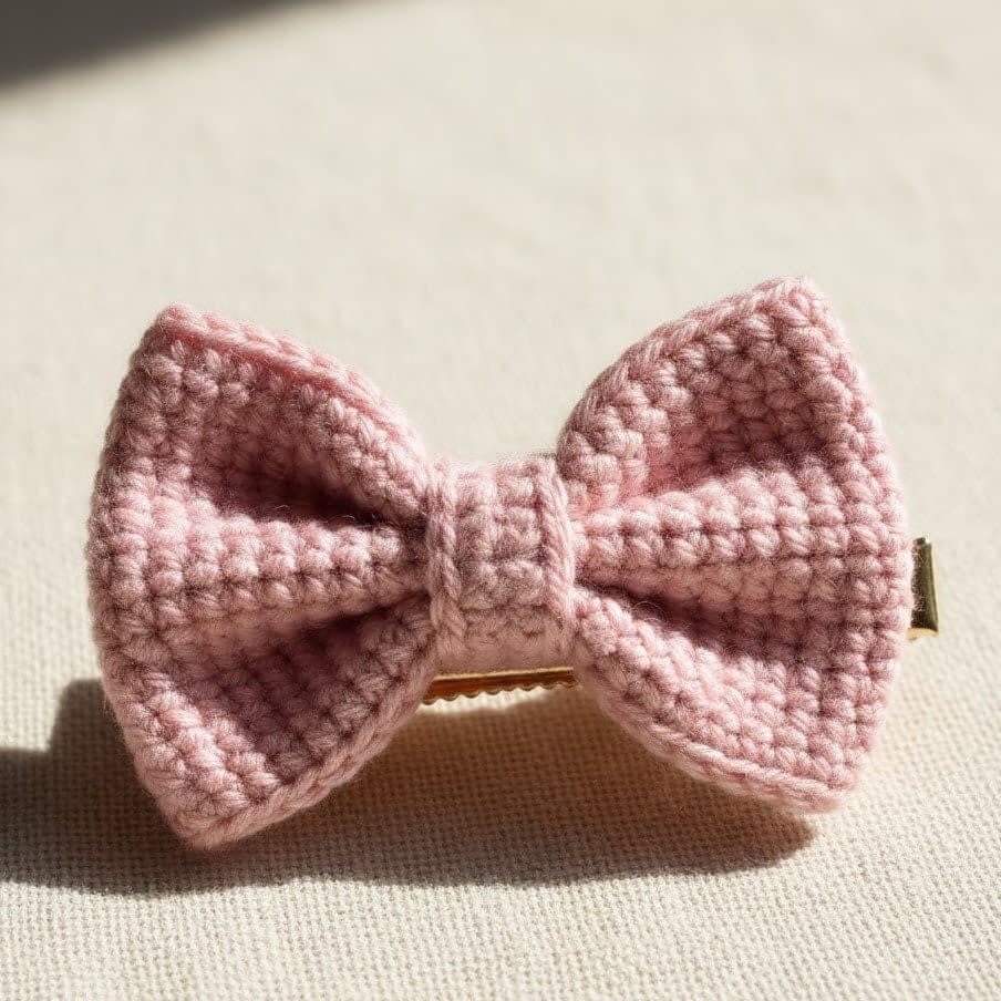 This mini bow is crocheted in one rectangular piece and cinched in the middle to form the bow shape. It is one of the easiest crochet accessories to make and can be customized by changing yarn color, texture, or size.