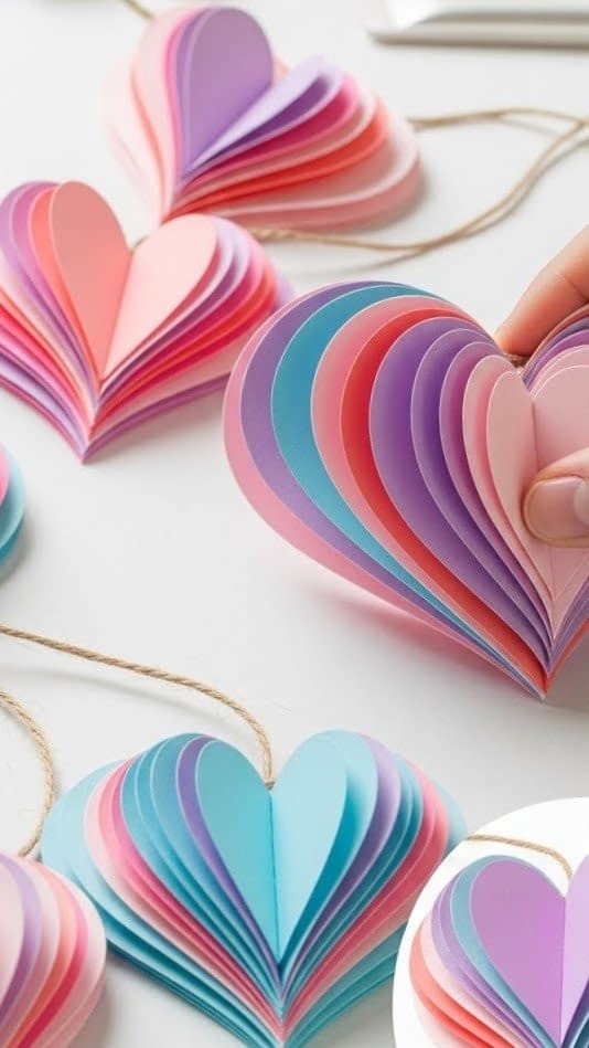 A layered 3D paper heart garland creates volume and depth using multiple folded hearts stacked together. These hearts expand outward, making the garland appear full and dimensional.