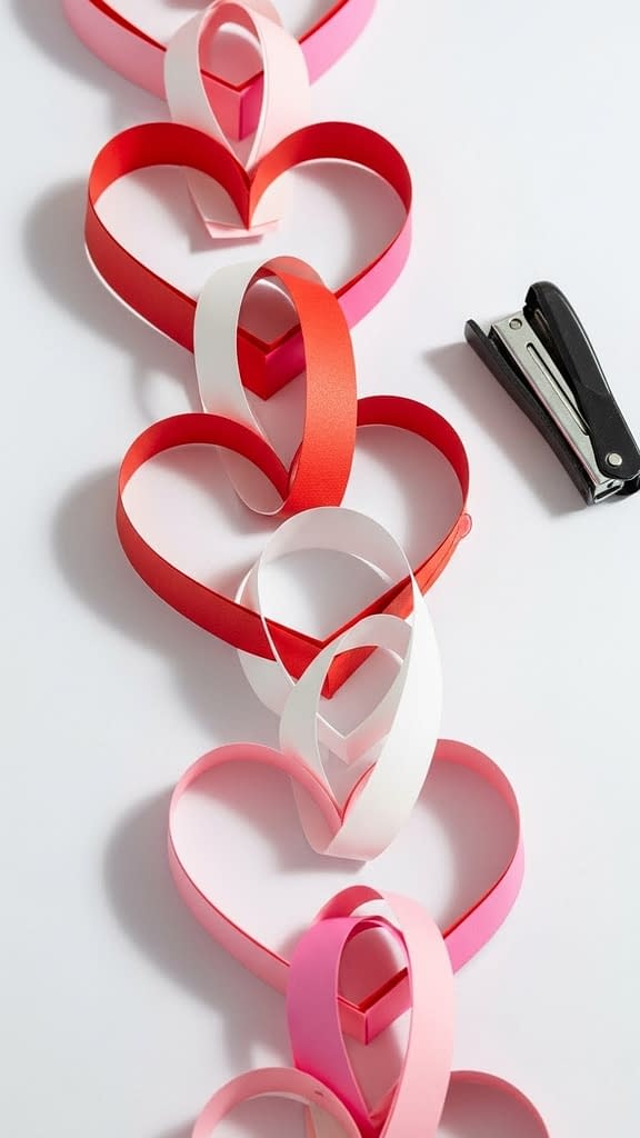 This garland uses strips of paper looped into heart shapes, then linked together. It’s visually eye-catching and requires no drawing templates.