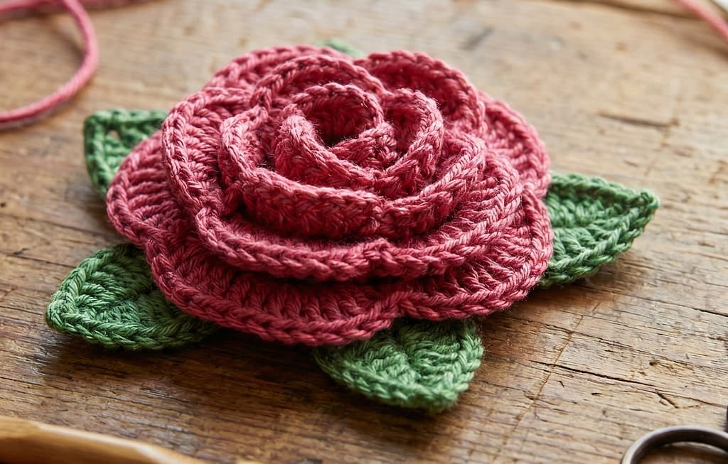 Dark pink or magenta yarn for the rose Leaf green yarn for the leaves A crochet hook size 4.0 mm Yarn needle and scissors