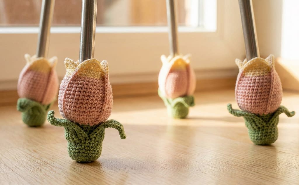 The first pattern in our collection transforms your furniture legs into a garden of blooming flowers. As seen in the reference visual, these Mini Tulip Bud Chair Socks feature a lush, bulbous shape that hugs the chair leg, sitting upon a green calyx base. The design mimics a tulip just before it fully opens, with tightly stitched petals in soft blush pink or pale yellow, and green leaves curling outward at the bottom. These are perfect for dining rooms or sunrooms where you want to bring a touch of nature indoors.