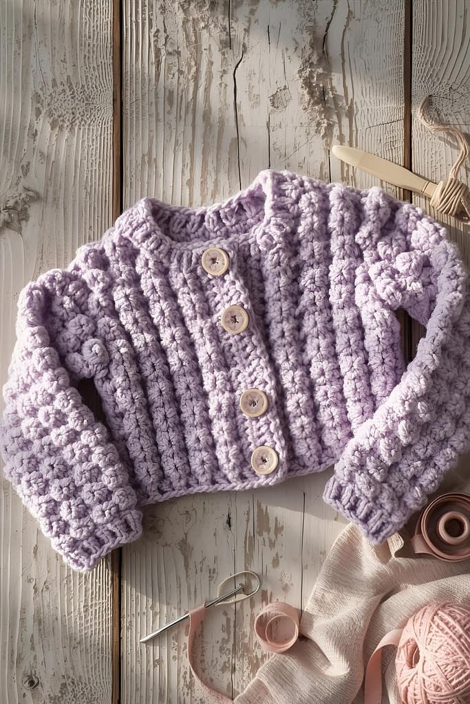 - Add a single crochet border around the front edges, spacing buttonholes evenly on one side.