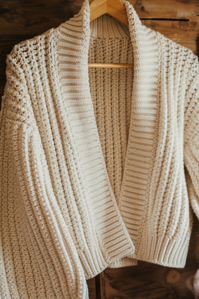 - Add a ribbed edging by working rows of single crochet along the bottom hem, cuffs, and front opening.