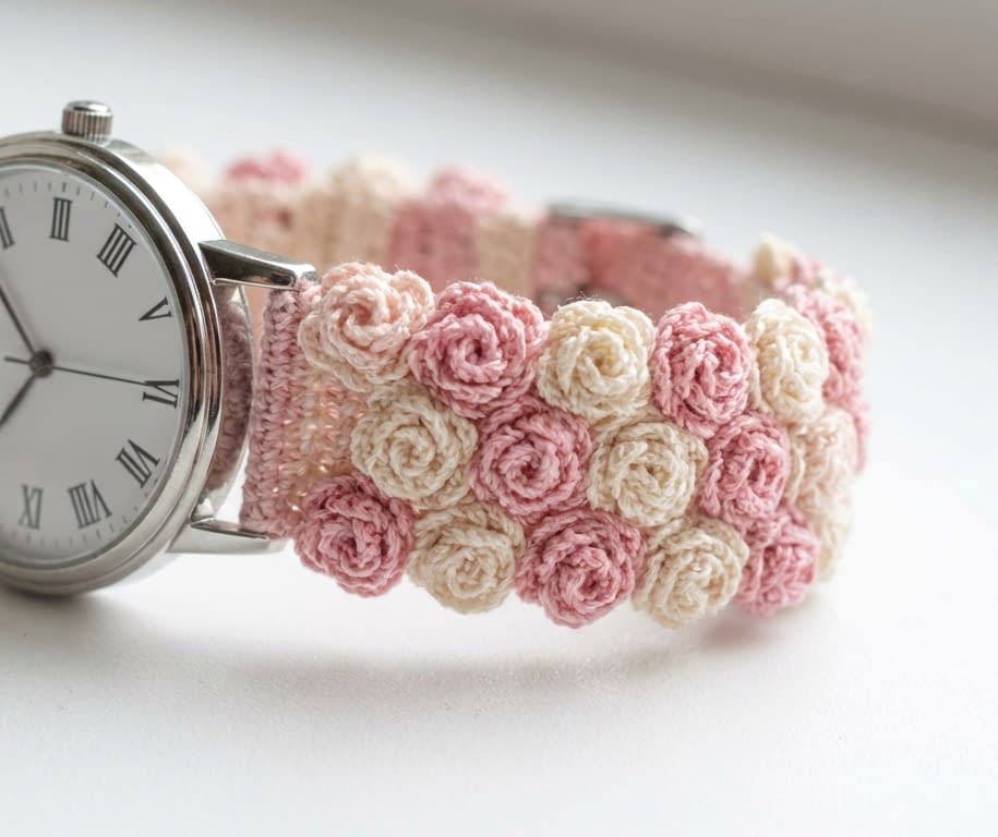Because the roses are heavy and textured, a simple crochet chain might sag. It is best to crochet a very tight single crochet base using two strands of yarn held together, or use a pre-made strip of canvas or leather as the core foundation. If crocheting: Chain the width of the watch. Single crochet in every row until you have the length.