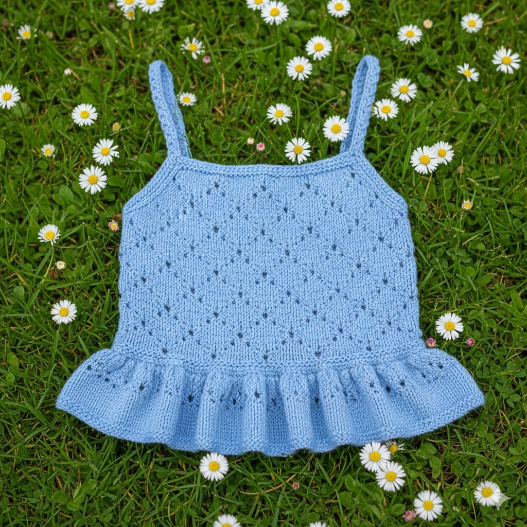 The camisole is worked flat as two panels with a fitted bodice that flares into a lace peplum at the waist. The delicate eyelet “forget-me-not” motif is created from small clusters of yarn overs and paired decreases that form tiny flower holes. The camisole uses narrow i-cord straps attached to the front and back shoulder points.