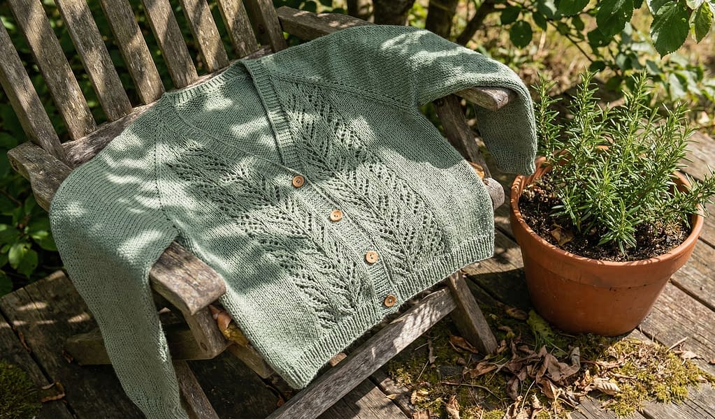 Beginner to intermediate. The cardigan uses simple lace repeats, basic increases and decreases, and straightforward seaming. Familiarity with knit and purl stitches, yarn over, decrease techniques, and reading a stitch repeat is useful.