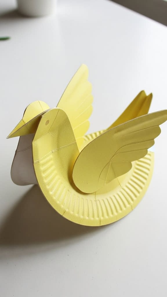 Once everything is dry, gently bend the plate again to reinforce the bird’s shape. This paper bird craft can be displayed flat or slightly propped up on a table.