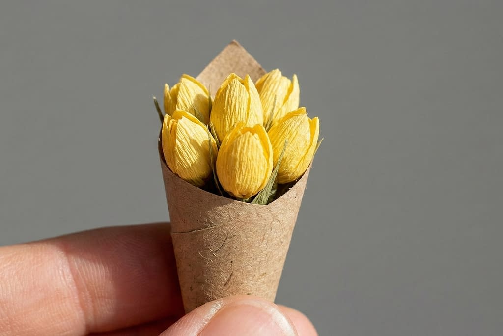 To mimic the visual, take a small square of brown kraft paper. Roll it into a very tight, narrow cone. Insert three or four of your yellow crepe buds into the cone. Secure the cone with a dab of glue or a small piece of tape. This miniature 8 tulip paper bouquet variation is all about texture and the charm of small things.