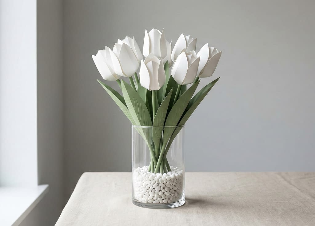 Place these white tulips in a cylindrical glass vase. To replicate the serene look of the image, fill the bottom of the vase with small white pebbles or faux stones. This anchors the stems and adds to the clean, monochromatic aesthetic that makes this specific 8 tulip paper bouquet idea so elegant.