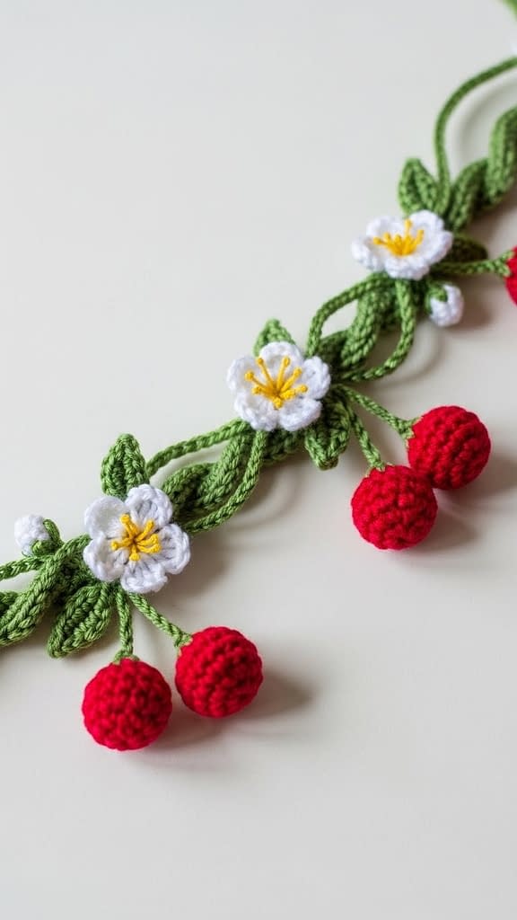This pattern mimics a delicate garden vine. Tiny white blossoms with yellow centers are paired with dangling cherry pompoms that add movement and charm. The key is balance: cherries should be small and lightweight so they do not pull on the band.
