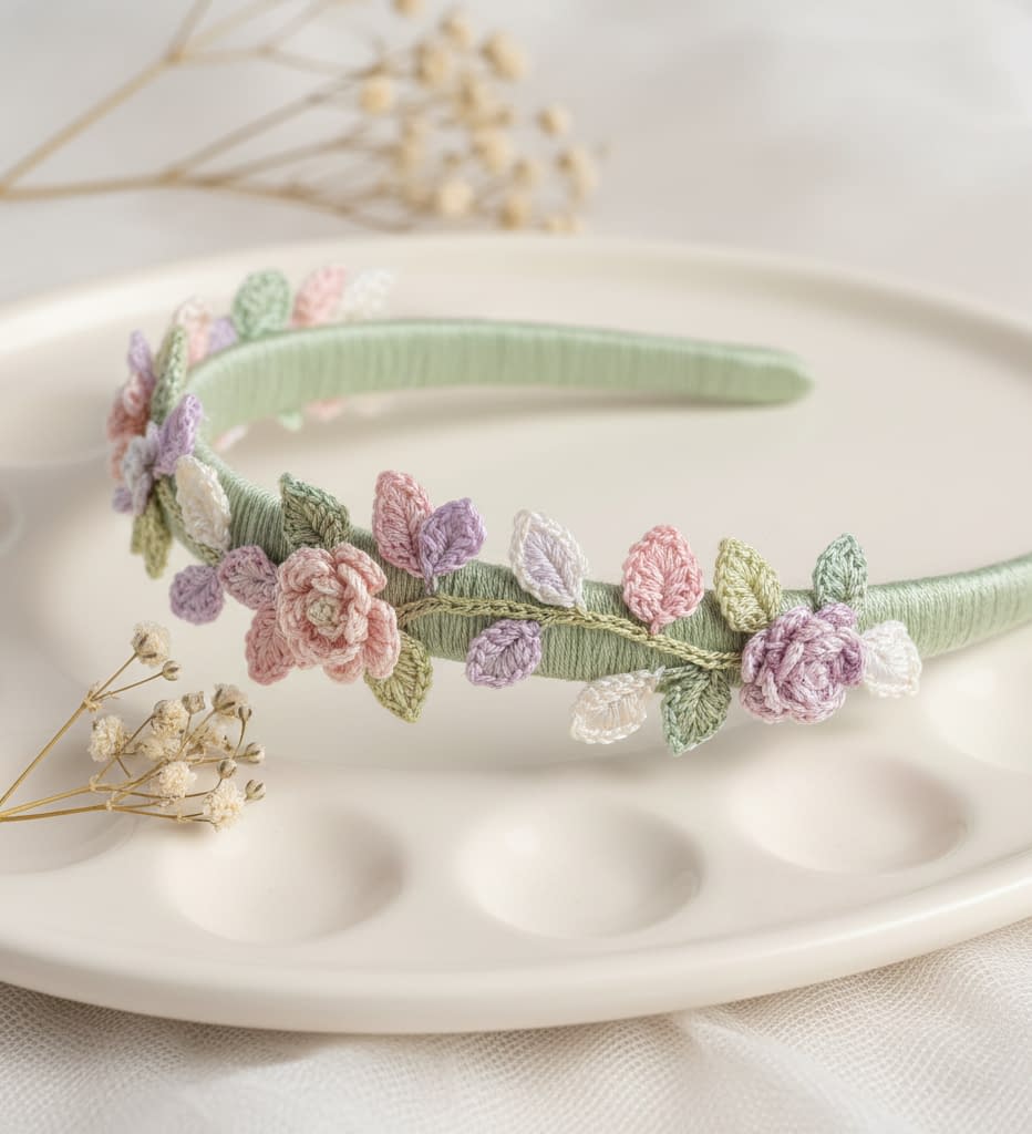 This headband is constructed in two main phases. Phase one is wrapping the slim metal band with the sage green yarn to create a neat base. Phase two is creating small layered petals and leaves separately and attaching them to the wrapped band in clusters. Each petal is crocheted as a narrow spiral or small petal motif and then layered to form a tiny blossom. The pattern emphasizes fine threadwork and gentle petal curl; therefore, blocking and gentle shaping are important.