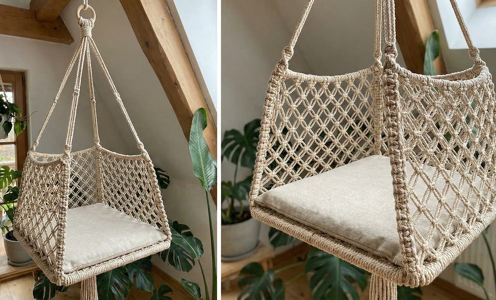 Macramé is traditionally associated with round shapes, which is why this square-based hammock is such a striking showpiece. It mimics the shape of a traditional box bed but suspends it in the air. The reinforced corners give it a crisp, tailored look, and the diamond netting softens the sides just enough to make it cozy.