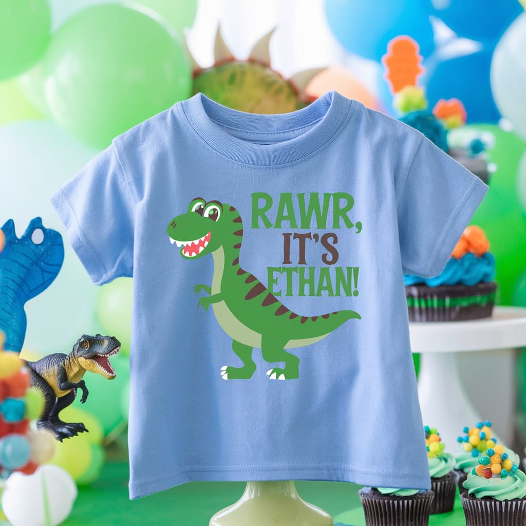 Example: A green dinosaur with “Rawr, It’s Ethan!” underneath makes a birthday shirt they’ll love.