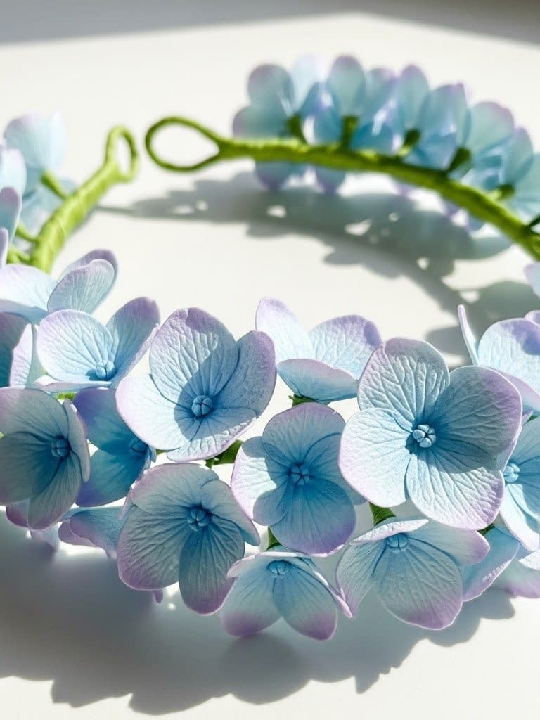 This crown is soft, romantic, and minimal. It features layered hydrangea-style flowers on a smooth band base.